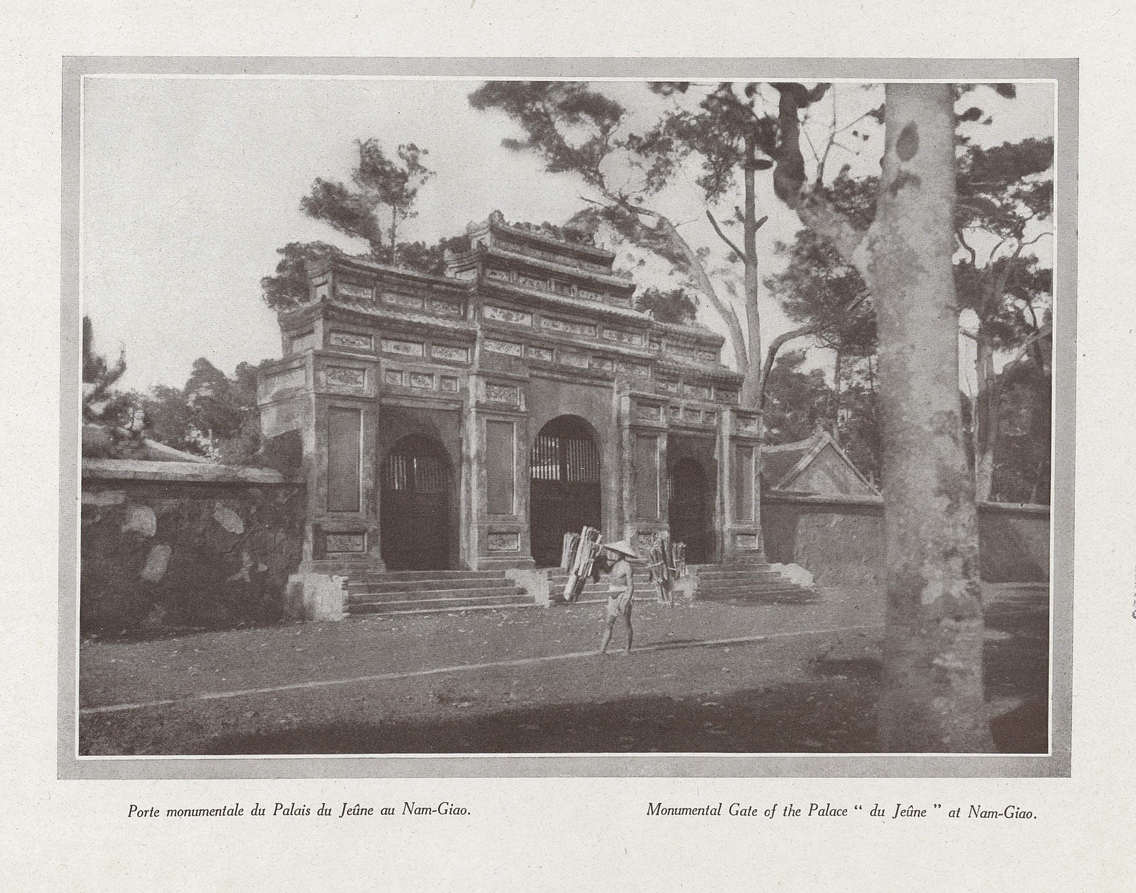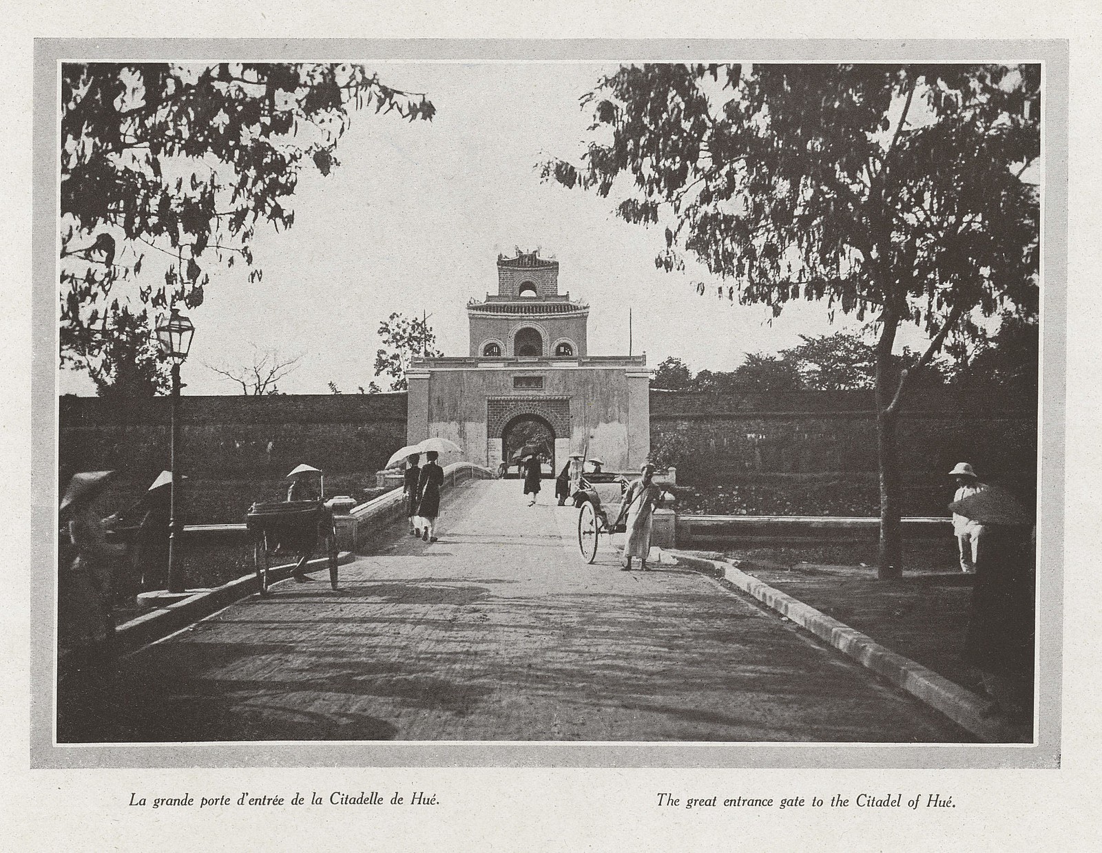 Người dân qua loại bên ngoài một cách cổng của Kinh thành Huế 100 năm trước. Ảnh được in trong sách ảnh “Annam 1919 – Đông Dương thuộc Pháp” (An Nam 1919 – L’Indochine française), xuất bản tại Paris năm 1919. Ảnh: Bunum.univ-cotedazur.fr.
