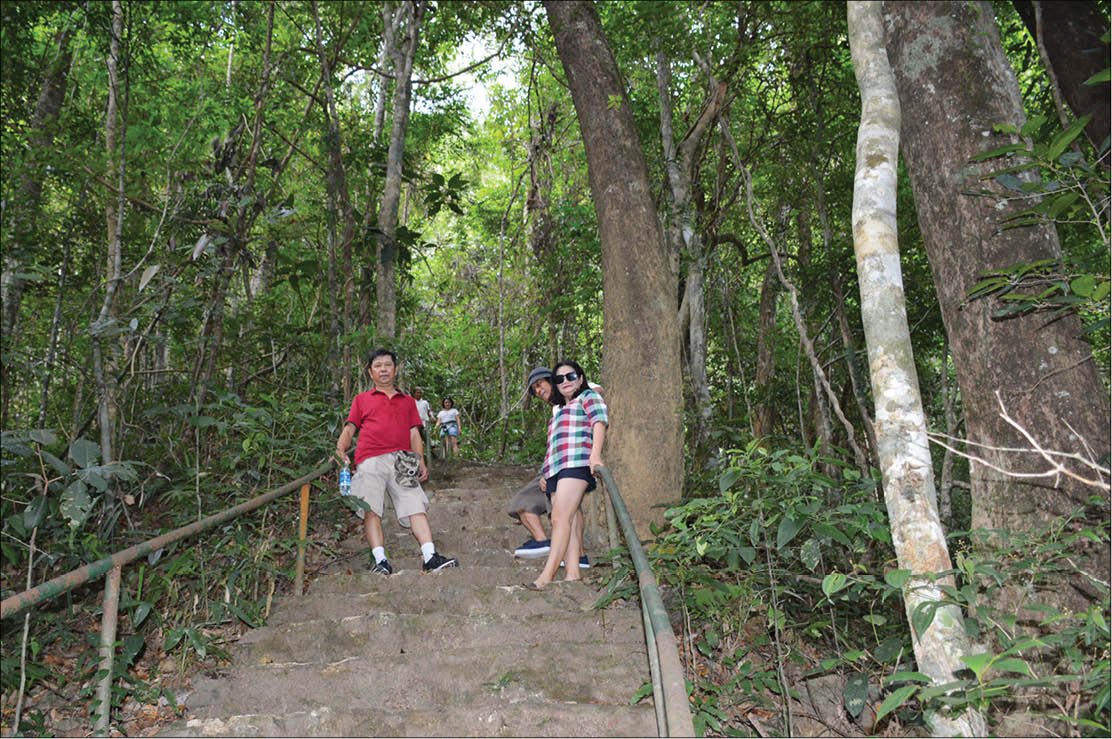 Chẳng hiểu làm sao cheo leo đến thế mà họ vẫn có thể vận chuyển cát đá, xi măng và treo mình xây được tuyến bậc cấp phục vụ nhu cầu khám phá của du khách. Chỉ tiếc là lần làm lần khó, trong môi trường ẩm ướt thường xuyên của rừng nhiệt đới, những người thiết kế, chủ đầu tư sao lại không chọn vật liệu phù hợp để đến nỗi hệ thống lan can tay vịn bây giờ đã hư hỏng, sụp đổ cả, trong lúc giá trị vật liệu không chừng còn thua cả tiền thi công, lắp đặt?!! Nhóm 6 người chúng tôi, 4 nam, 2 nữ vừa đi vừa nghỉ, vừa cười đùa động viên nhau, bỗng nghe ầm ào tiếng thác, và hơi gió mát rượi lách rừng thổi đến. Chúng tôi biết mình đã sắp đến đích. Đây rồi, bậc cấp cuối cùng. Chào đón chúng tôi là một cánh rừng già, thoáng đãng, uy phong và đẹp như cảnh trong phim. Bao nhiêu mệt nhọc như tan loãng đi. Hào hứng lưu lại những bức ảnh với cây rừng Bạch Mã, sau đó, rẽ cây tiến về phía chân thác. Từ trên đỉnh cao chót vót, một cột nước trắng xóa ầm ào đổ xuống. Phải lùi rất sâu, đẩy ống kính xa tối đa, và cả nằm rạp xuống nữa, mới có thể thu hết cột nước vào trong khuôn hình. May mà smart phone và camera kỹ thuật số, còn không thì đến “cháy” phim mất. Nghỉ ngơi, phim ảnh thỏa thuê, chúng tôi chào Đỗ Quyên, chào thác nước hùng vĩ để quay lại với con đường bậc cấp. 689 bậc cấp dẫn lên đỉnh thác đang chờ thách thức chúng tôi. Không sao, xuống được thì tất lên được. Và sau gần một tiếng vừa leo vừa… thở, chúng tôi đã đến nơi trong sự chào đón của bạn bè và trong niềm vui “Vượt lên chính mình”.