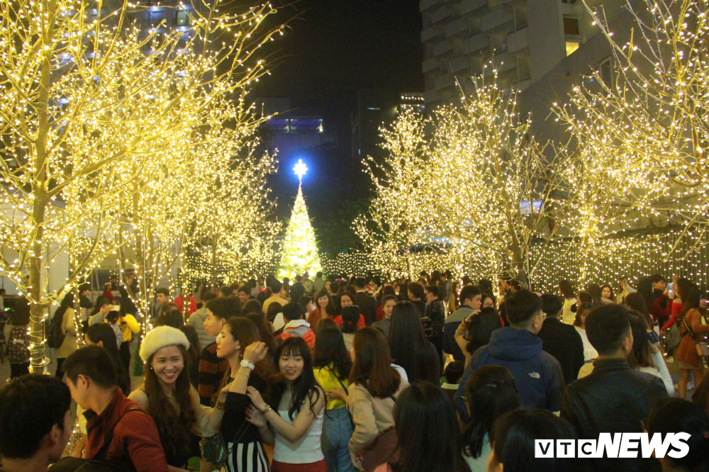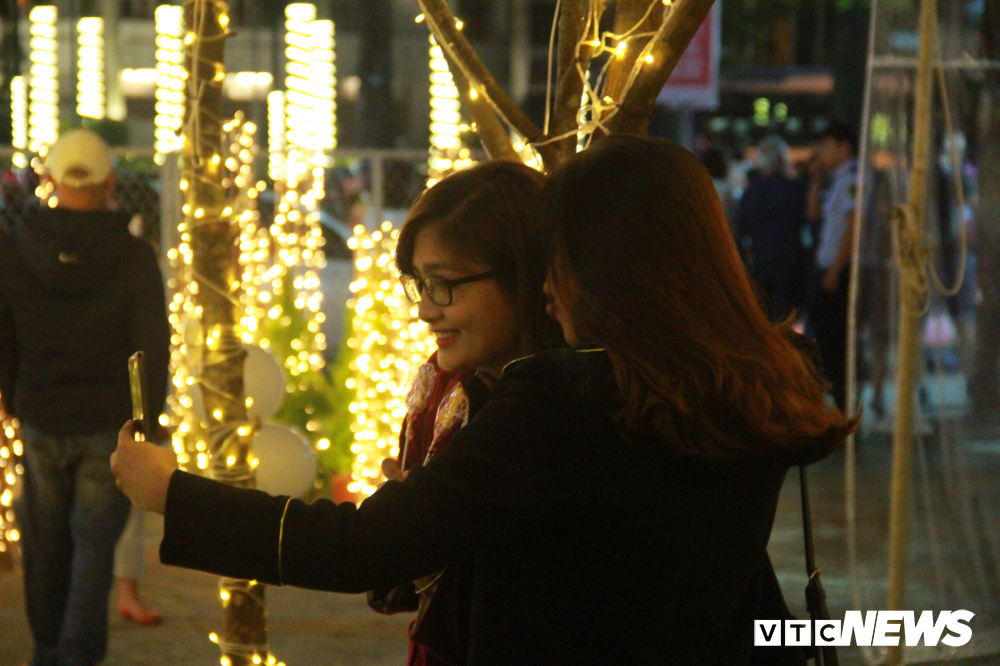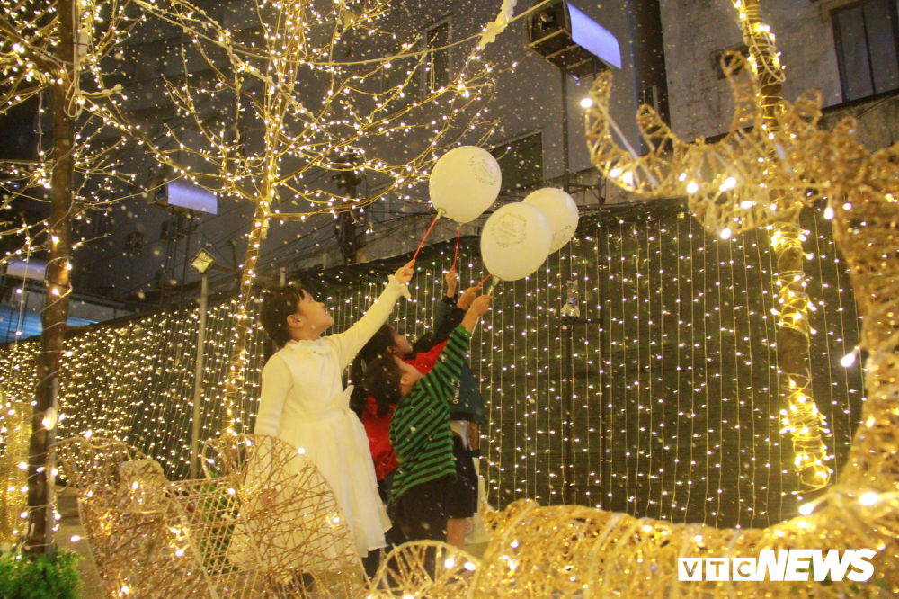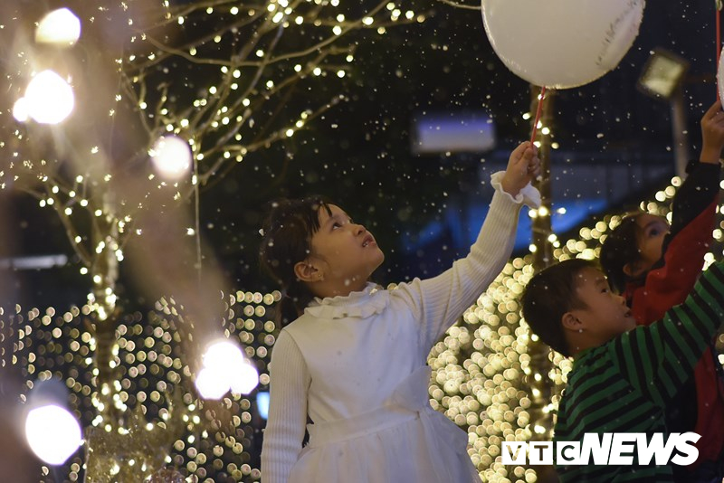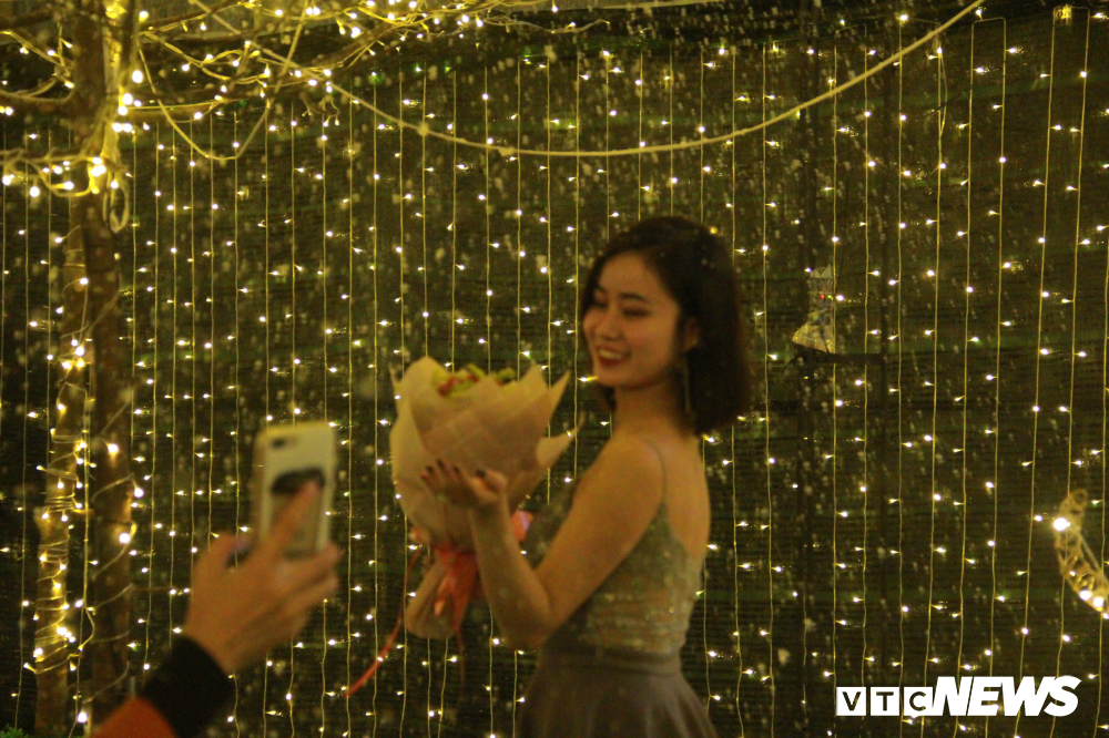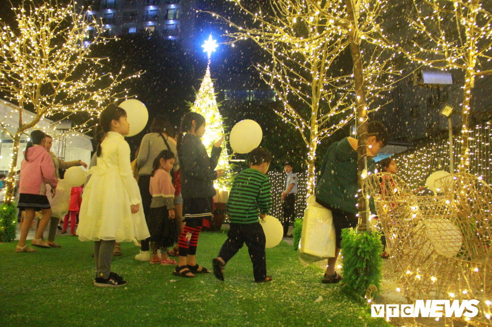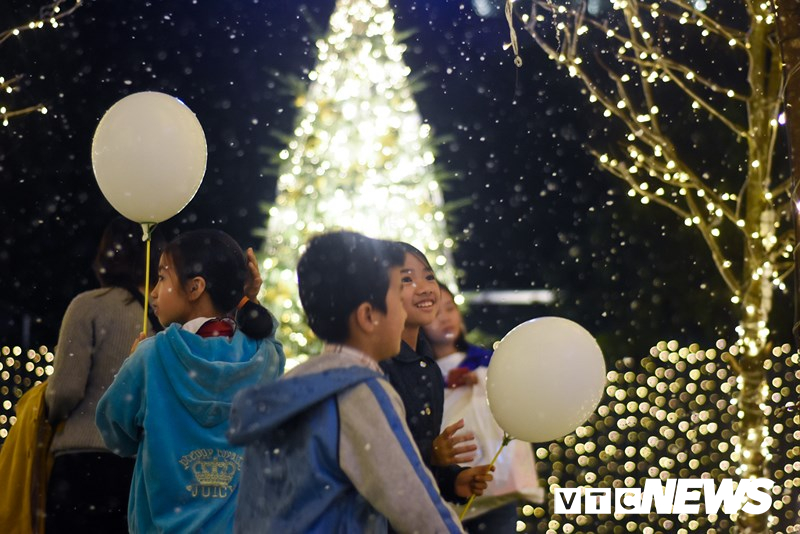 Hàng trăm bạn trẻ từ khắp nơi đổ về Khu vườn Giáng sinh ở đường Lê Lợi (TP Huế) để ngắm "tuyết rơi".