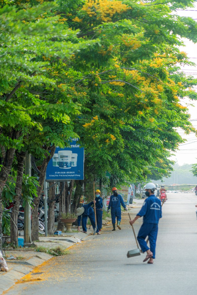 Những công nhân làm vệ sinh dưới tuyến đường rực vàng sắc hoa