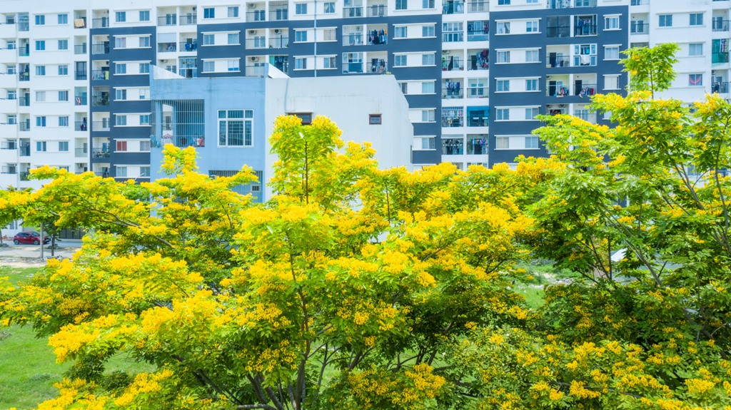 Màu hoa sưa vàng rừng điểm tô cho đô thị và các khối kiến trúc trở nên hài hòa, mềm mại