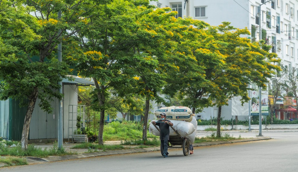 Một người lao động kéo xe đi qua dưới đường hoa rợp bóng khoe sắc
