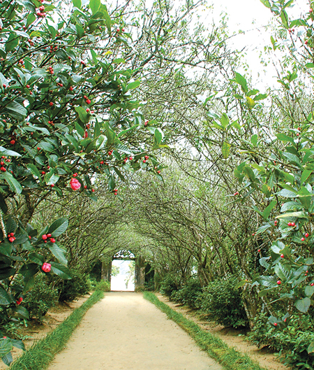 Nhà vườn ở Kim Long được tạo dựng bởi tài năng, trí tuệ và công sức của những người thợ tài hoa và sử dụng những vật liệu địa phương quý hiếm, nó không chỉ là thành tựu của sự chọn lọc những giải pháp tối ưu trong xử lý kỹ thuật mà còn là một tác phẩm nghệ thuật về kiến trúc đã được đúc kết và hoàn thiện qua nhiều thế hệ. Lối vào nhà vườn được mở từ phía trước ngôi nhà bởi một con đường uốn lượn giữa hai hàng chè tàu và hai hàng cau; tiếp đến là bình phong đủ để che chắn cho ngôi nhà khỏi mọi tai ương đến từ bên ngoài, nhưng lại không quá cao để che chắn tầm nhìn khiến chủ nhân không thể thưởng ngoạn hương sắc của các loài thảo mộc trong vườn.