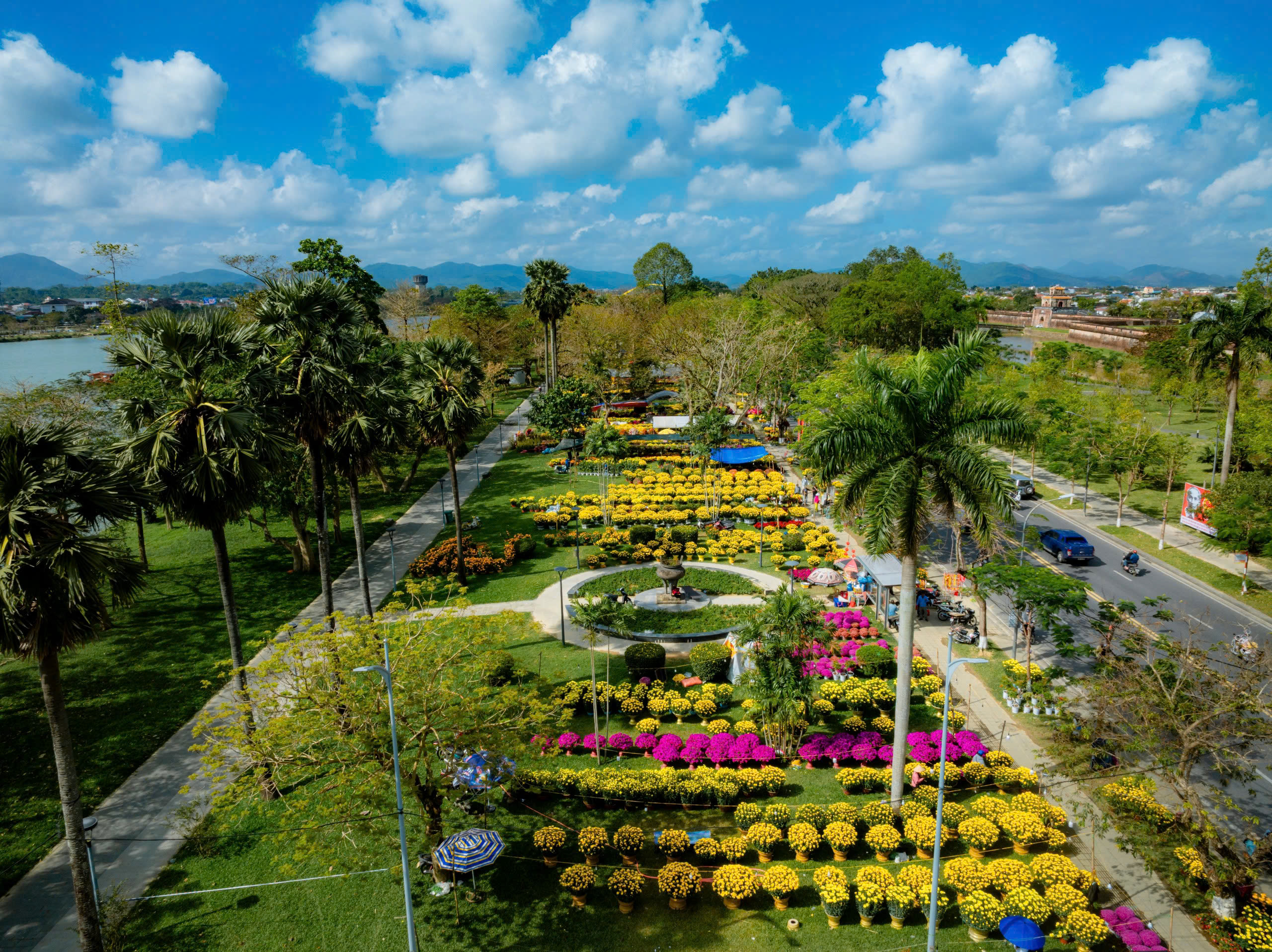 Mỗi độ Tết đến xuân về, Huế lại khoác lên mình một tấm áo mới – rực rỡ, tươi tắn và đầy sức sống. Nếu mùa thu Huế dịu dàng trong sương sớm, mùa hè sôi động cùng Festival, thì những ngày giáp Tết, thành phố bên dòng sông Hương trở nên nhộn nhịp, ấm áp hơn bao giờ hết. Và một trong những điểm hẹn không thể bỏ lỡ đối với du khách khi đến Huế dịp này chính là chợ hoa Tết dọc công viên ven sông Hương, trải dài theo trục đường Lê Duẩn và khu vực trung tâm gần Nhà hát Lớn.