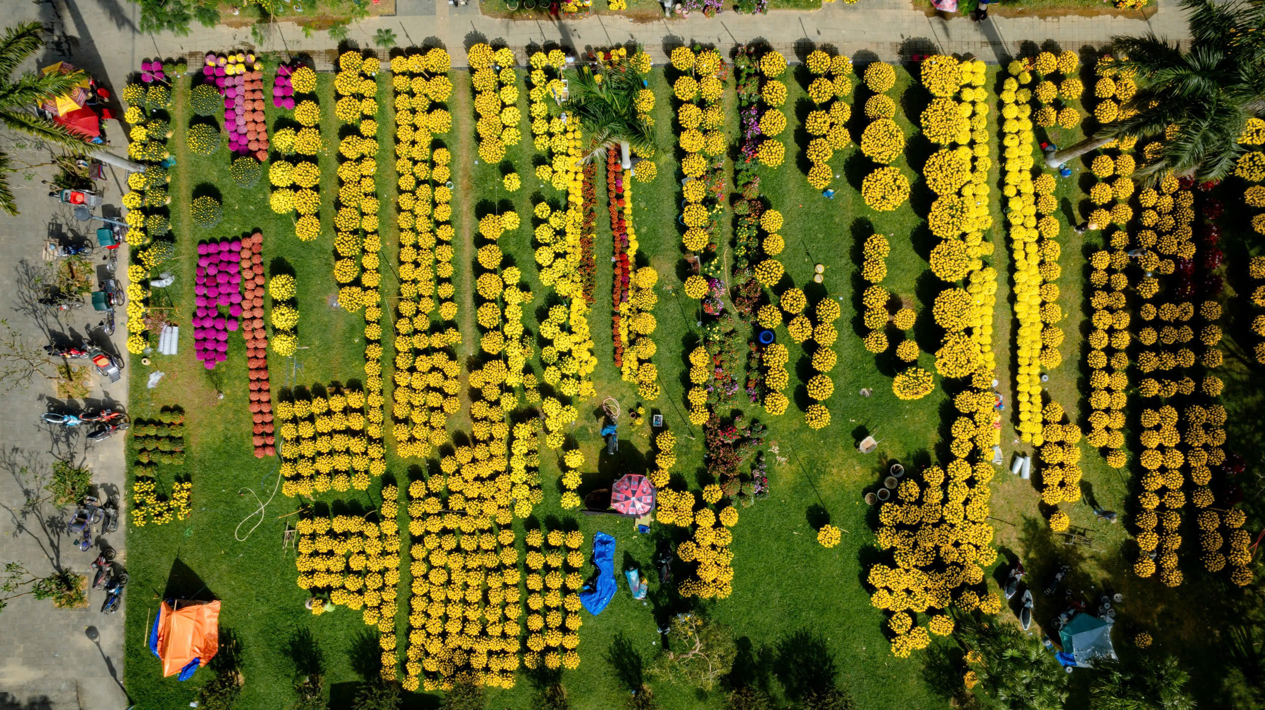 Du khách đến đây sẽ dễ dàng bắt gặp những chậu mai vàng tỏa sắc ấm áp, những cành đào hồng phai mềm mại, những cây quất sai trĩu quả tượng trưng cho tài lộc, hay những giỏ lan thanh nhã được chăm chút tỉ mỉ. Hoa cúc – loài hoa quen thuộc của Tết miền Trung – chiếm một vị trí đặc biệt với sắc vàng tươi trải dài như nắng xuân.
