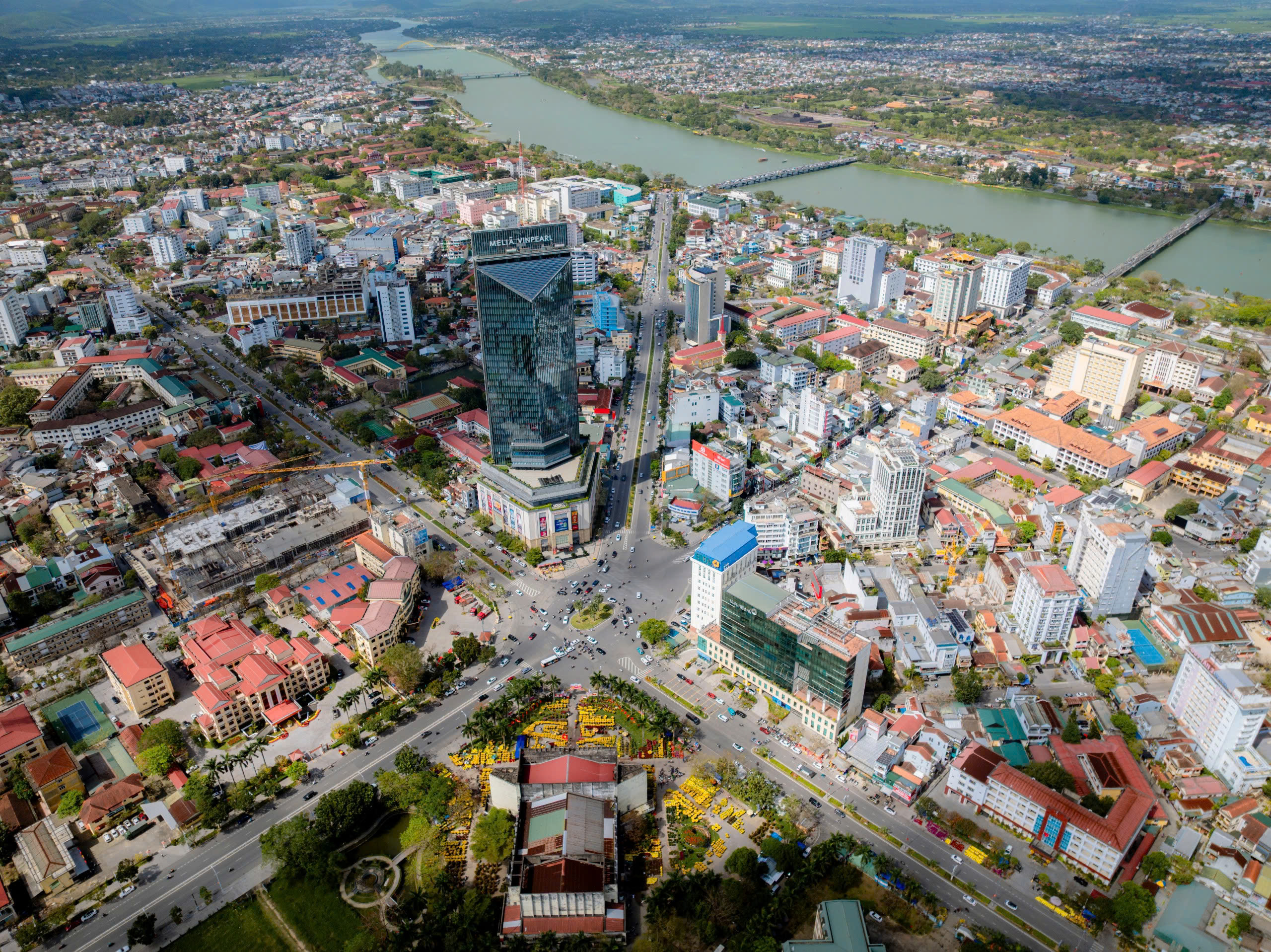 Một bên là mặt nước phẳng lặng của sông Hương, phản chiếu bầu trời xanh và những nhành hoa rực rỡ; một bên là thảm hoa đủ sắc màu đan xen giữa tiếng nói cười rộn ràng của người mua kẻ bán. Không gian ấy vừa mang nét thanh bình đặc trưng của Huế, vừa có nhịp điệu sôi động của những ngày cuối năm.