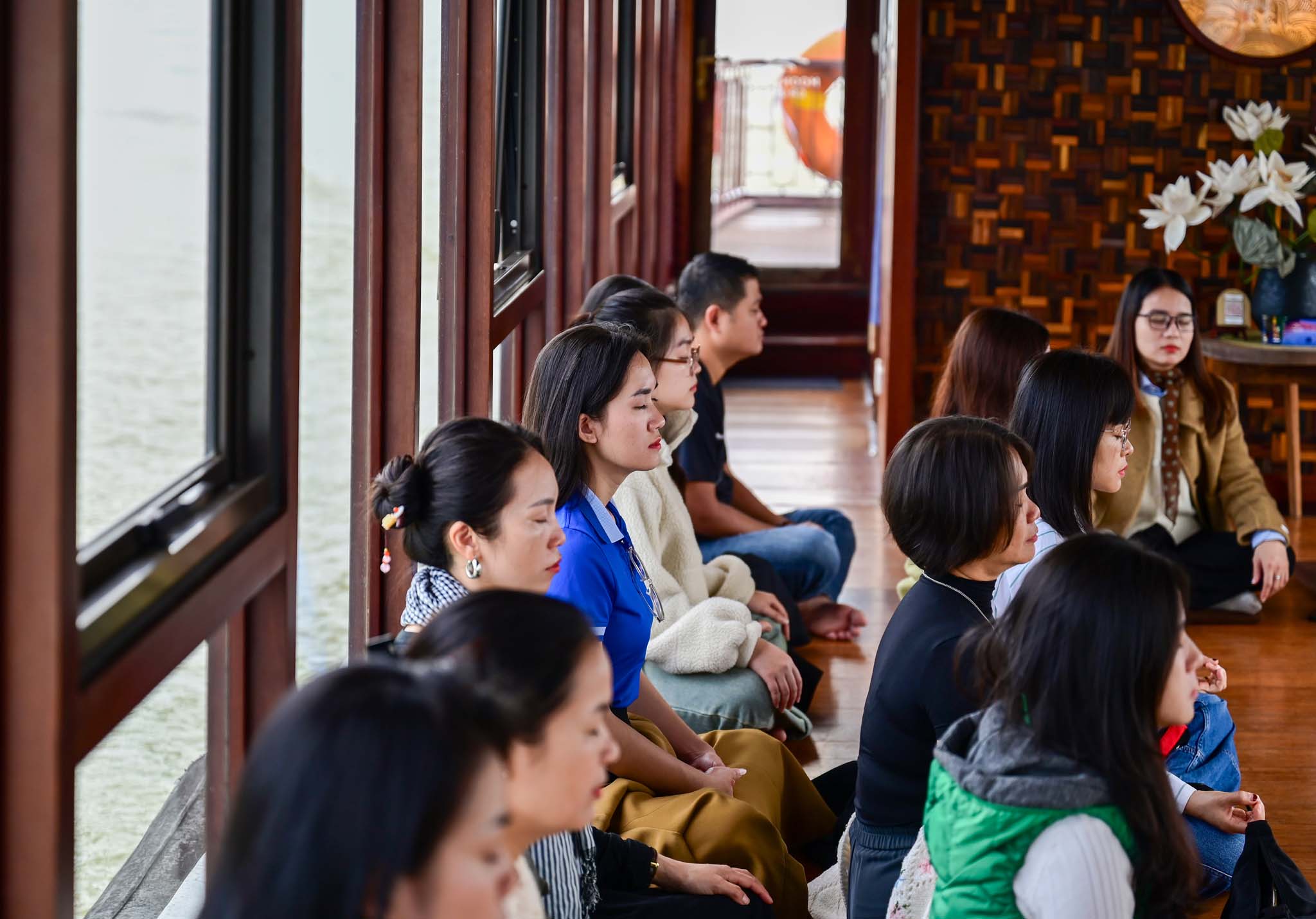 - Trên du thuyền Sông Trăng - Moon River, đoàn tham gia trải nghiệm “Thiền Chuông - Chuông xoay Himalaya”. Đây là phương pháp chăm sóc thân, tâm, trí độc đáo, lần đầu tiên được giới thiệu trên dòng sông Hương. Trong không gian tĩnh tại, tiếng chuông ngân và phương pháp xoay năng lượng giúp người tham dự thư giãn sâu, mang lại cảm giác cân bằng và phục hồi tinh thần.
