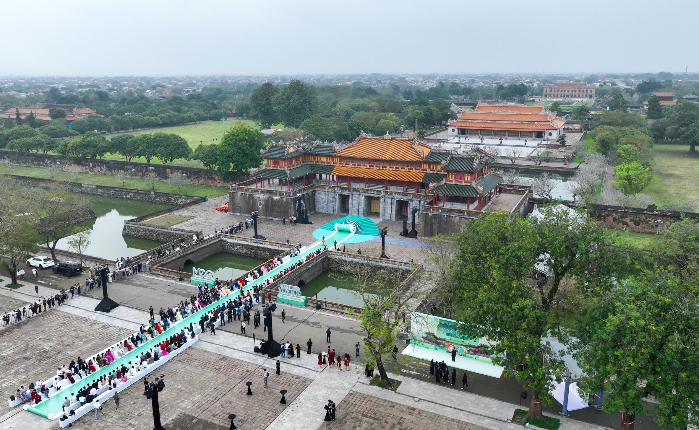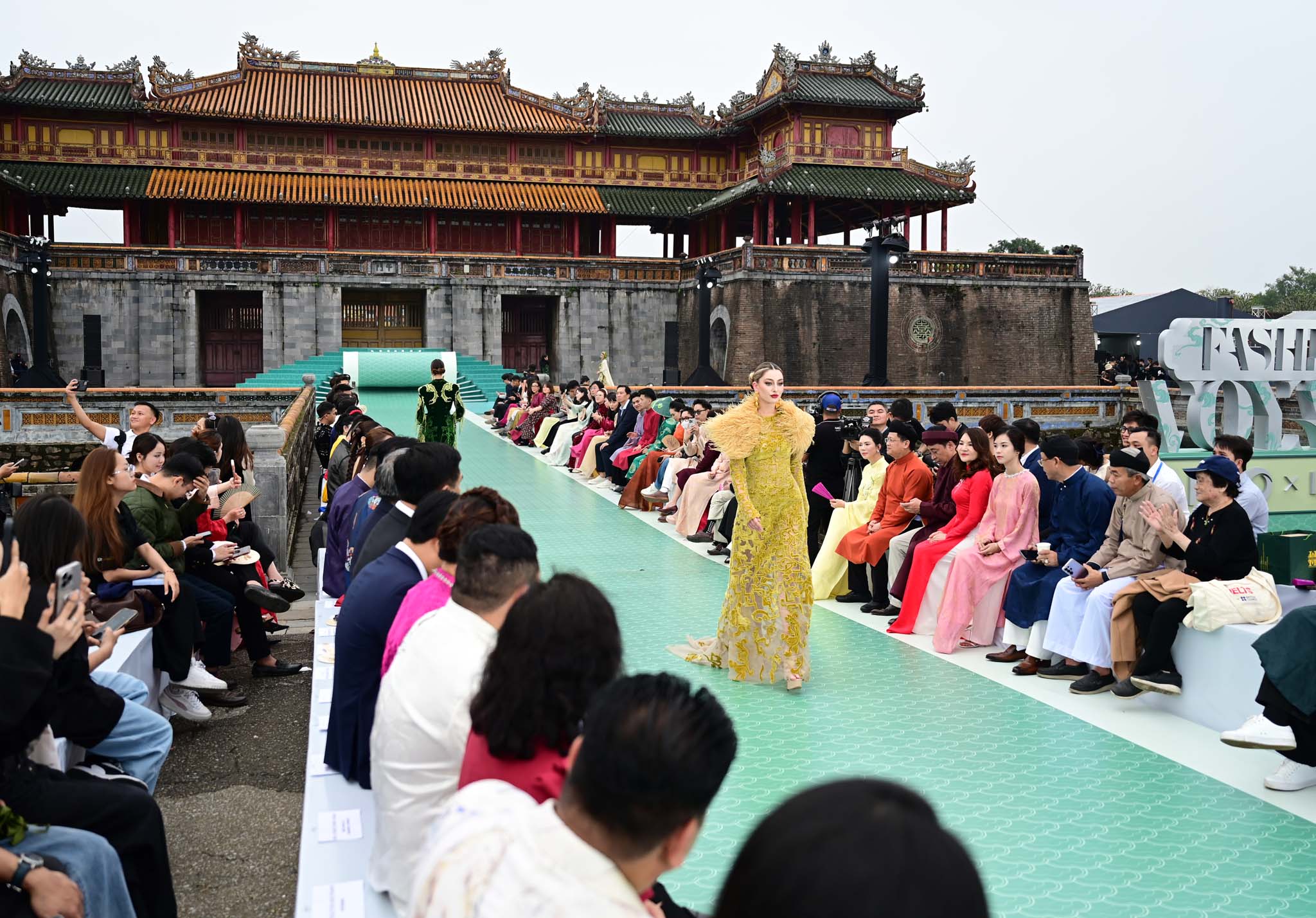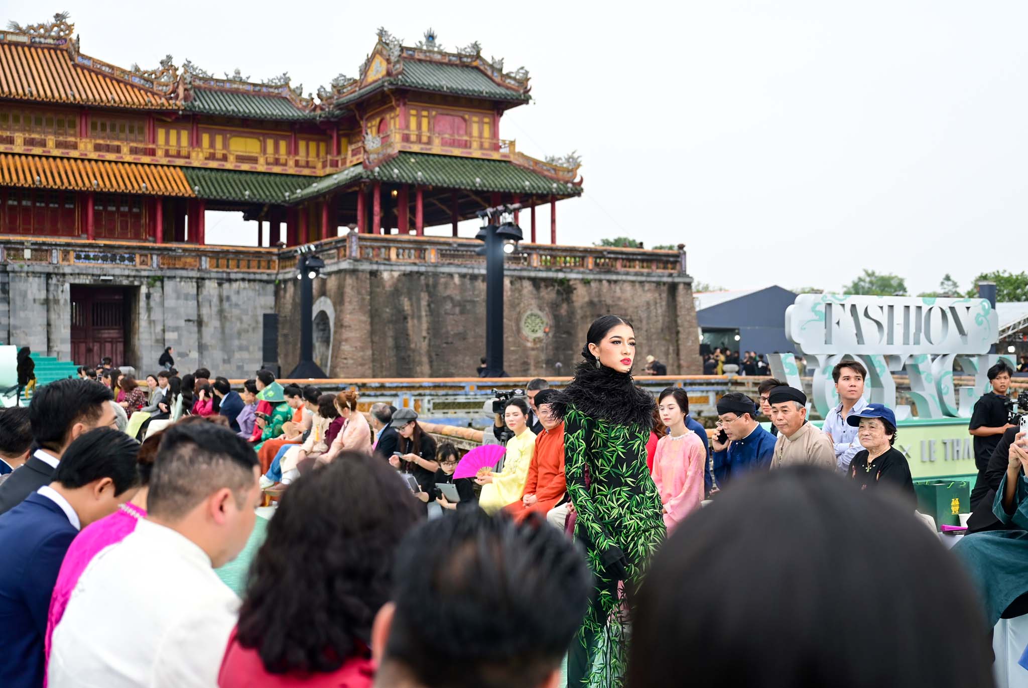 Sàn diễn được thiết kế đặt đúng trên trục hoàng đạo, bắc qua đôi hồ nước trước Ngọ Môn, tái hiện hành trình qua các lớp không gian phong thủy: Đất - Nước - Di sản - Con người. Từ lối dẫn dài vươn thẳng đến Cửa Ngọ Môn, mọi chuyển động của người mẫu đều trở thành một cuộc đối thoại giữa thời trang đương đại và giá trị cung đình truyền thống. Đây không chỉ là một sàn runway, mà còn là một hành trình, nơi mỗi bước chân đều mang theo di sản Việt Nam vươn ra thế giới.