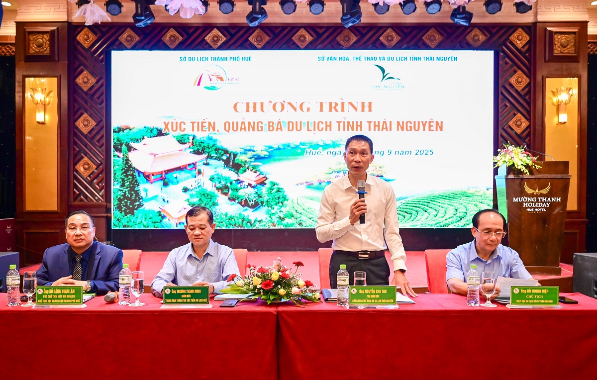 Sáng 27/9/2025, tại khách sạn Mường Thanh Holiday Huế, Sở Văn hóa, Thể thao và Du lịch tỉnh Thái Nguyên đã tổ chức Hội nghị xúc tiến, quảng bá du lịch tỉnh Thái Nguyên năm 2025. Sự kiện nhằm giới thiệu tiềm năng, thế mạnh du lịch của địa phương sau khi sáp nhập, đồng thời thúc đẩy hợp tác đầu tư, kết nối với các doanh nghiệp du lịch tại Thành phố Huế và khu vực miền Trung.